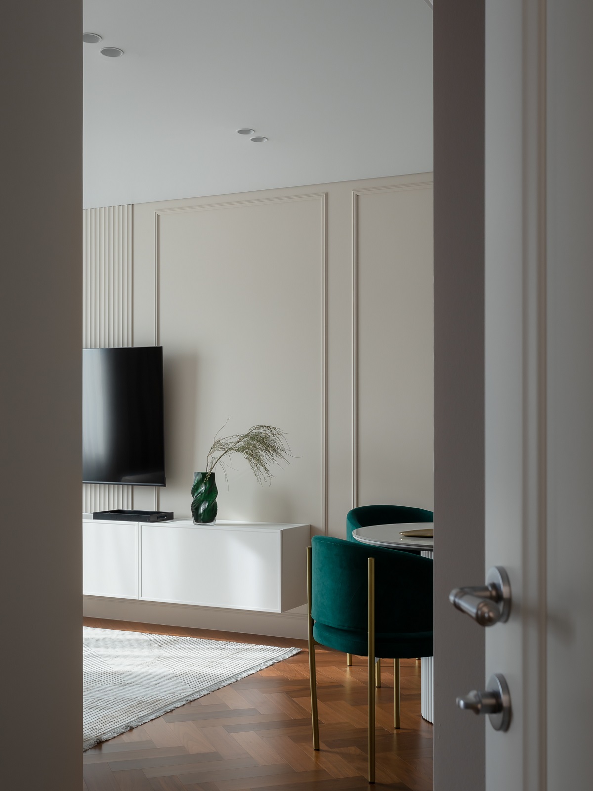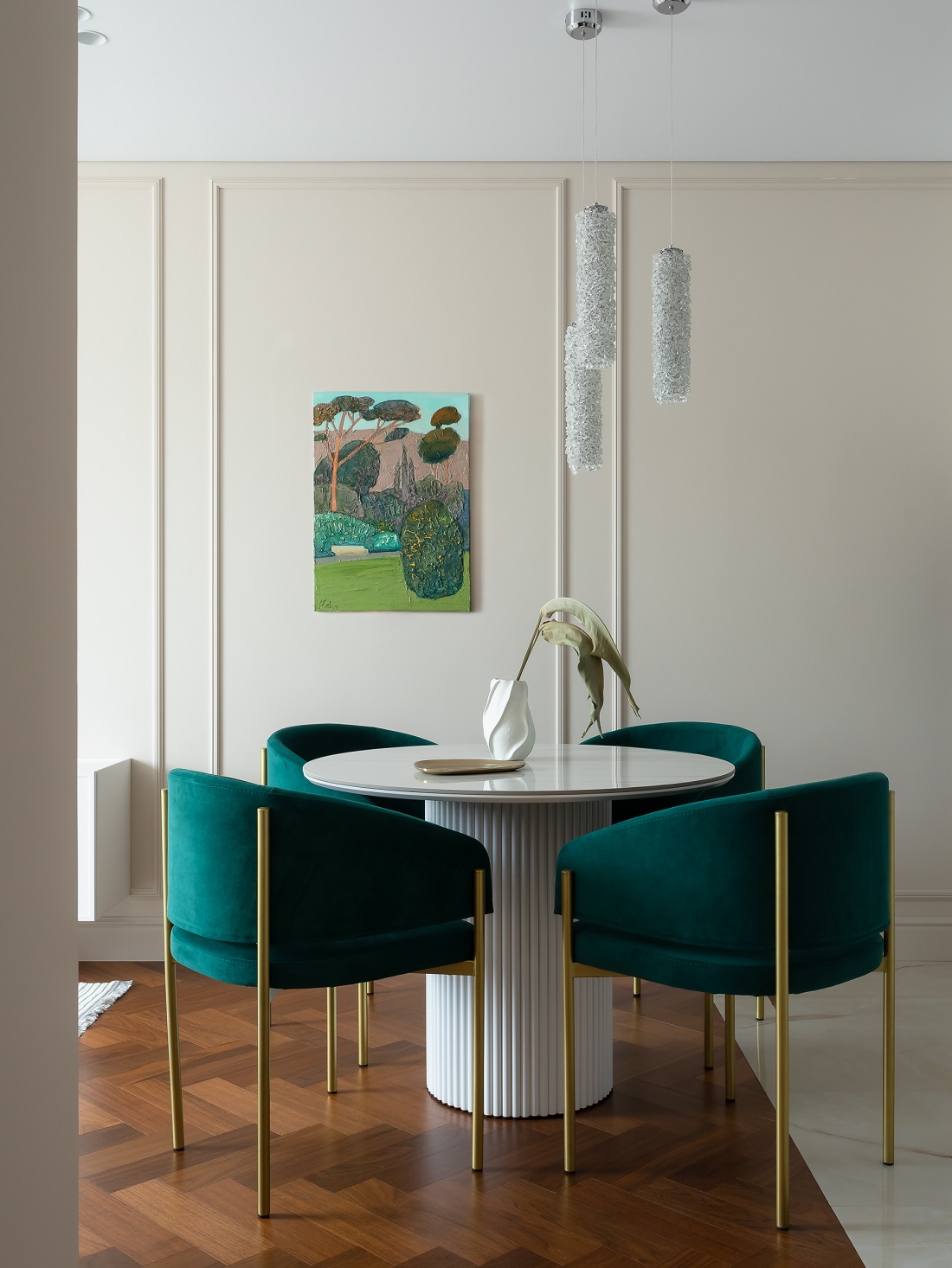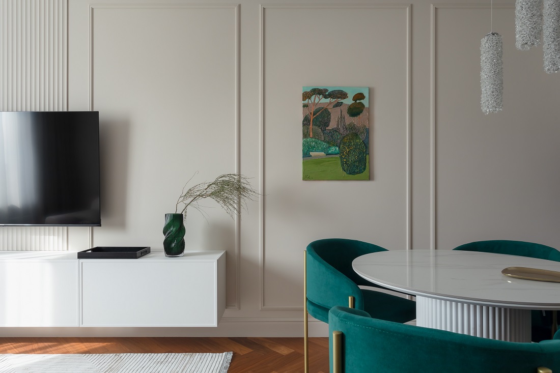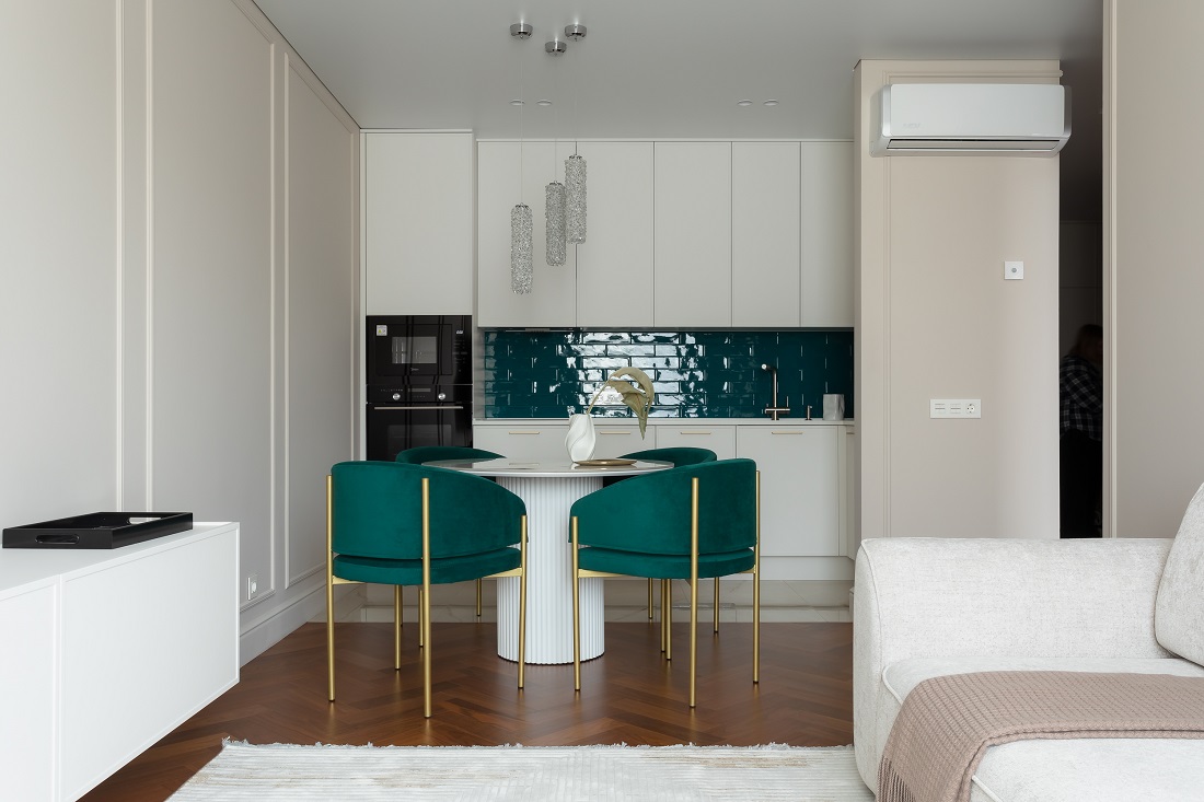 Задачей дизайн-проекта было создать пространство, которое будет нравиться всем, поэтому дизайнер Ольга Казанцева выбирала беспроигрышные сочетания цветов и материалов: светлые крашеные стены, натуральное дерево на полу, яркий акцент приятного глазу сине-зеленого цвета.