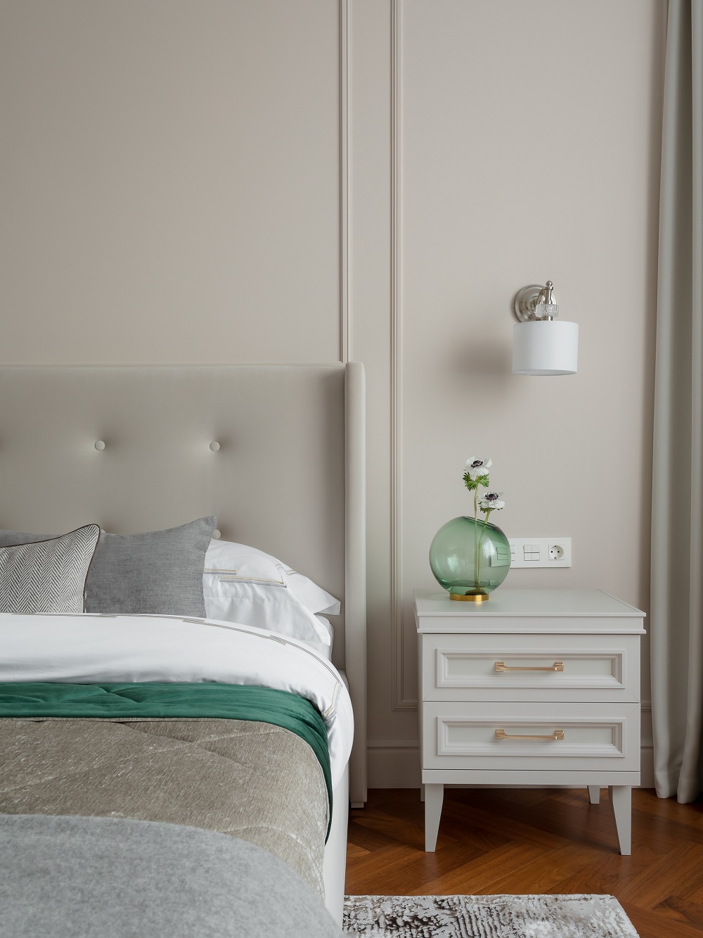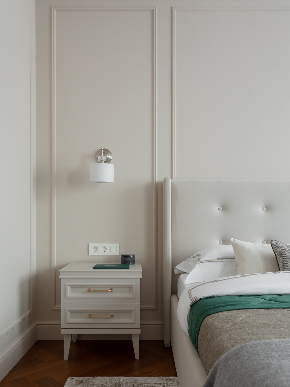 Так как квартира находится в премиальном доме, отделочные материалы здесь соответствующие: на полу – кварцевый паркет, розетки и выключатели класса комфорт, хороший дорогой матрас, умный дом.